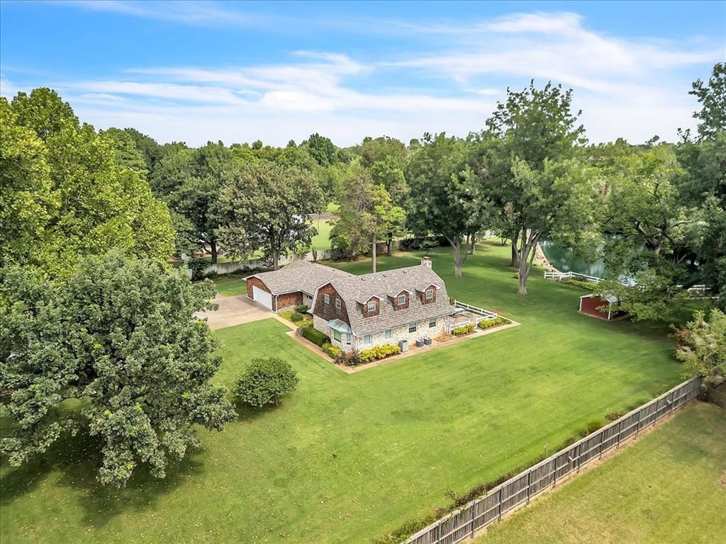 This private sanctuary includes 3 lots all being sold together, MLS 1223059 (1.45 acres w/shop $135,000,) & MLS 1223060 (1.49 acres vacant land $75,000.) Total price for all 3 properties $799,000.Nestled on 4.9 acres (mol), this remarkable estate includes a home, a 30 x 45 shop, and 1.4 (MOL) of land offering a rare lifestyle centered around a magnificent, 14-ft deep shared pond. Enter the home through a grand entrance with double doors. The heart of the home is the chef's kitchen, featuring custom cabinetry, extra-wide granite countertops, and stainless steel appliances, with an oven with warmer and built-in microwave. Thoughtful details include triple-filtered water, reverse osmosis, a trash compactor & instant hot water at the sink. An outstanding feature is the second fully equipped kitchen attached to private quarters, ideal for multigenerational living, a mother-in-law suite, or guest wing. The large living area is anchored by a stunning 30 ft wide, wood-burning fireplace crafted from Calumet rock-a beautiful feature that matches the home's exterior. Enjoy a serene view of the pond and local ducks that call this property home through massive picture windows. The downstairs primary suite features bay windows, walk-in closet, bath with walk-in shower & double vanities. Upstairs 2 large bedrooms are connected by a Jack-and-Jill bath with a private vanity area. The backyard is a private resort-like outdoor oasis. The stocked pond features a fountain, aerator, and charming bridge for fishing. A handmade island in the center is a favorite nesting spot for ducks. Enjoy the view from the concrete deck or large back porch. The property is kept lush by a 13-station irrigation system with 120 sprinkler heads. Features: 2 yr old Class 4 roof, 4 HVAC's (3 compressors and mini-split for garage,) 3 interconnected private wells, sophisticated water softening/filtration system, 220V plug in the garage for EV charging, 25 HP mobile generator.
