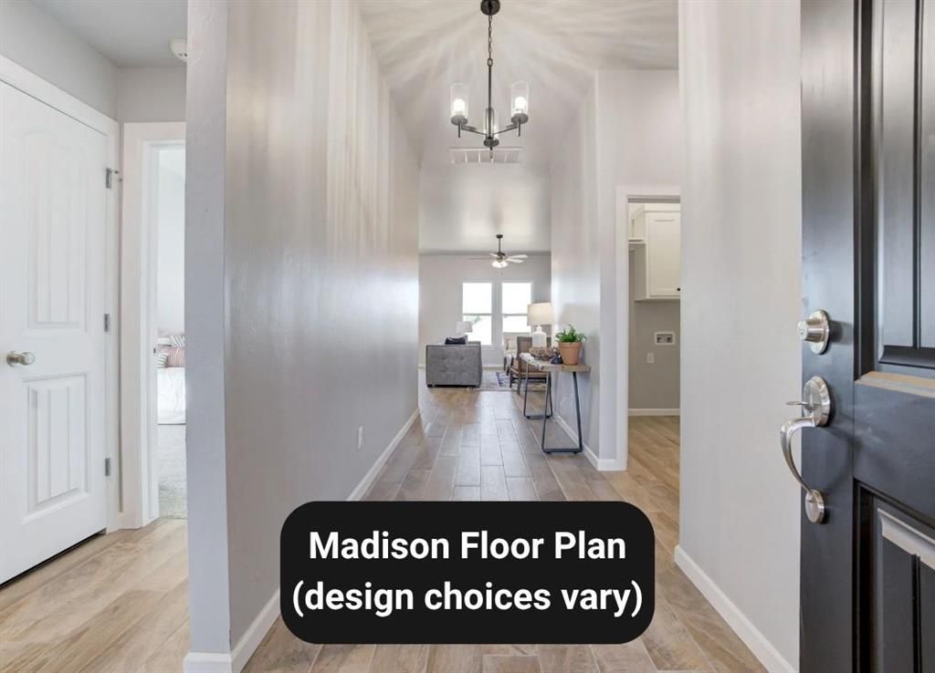 The Madison blends spacious comfort with smart, intentional design, offering an open living area with vaulted ceilings that flows seamlessly into a well-appointed kitchen and dining space ideal for both daily life and entertaining. The kitchen features a center island, walk-in pantry, and direct access to the backyard for easy indoor-outdoor living. The private primary suite creates a true retreat with dual vanities, a walk-in shower, and a generous closet connected directly to the utility room for added convenience. Two additional bedrooms share a well-designed hall bath, and the covered front porch with Craftsman-style details adds timeless curb appeal to the home's exterior.